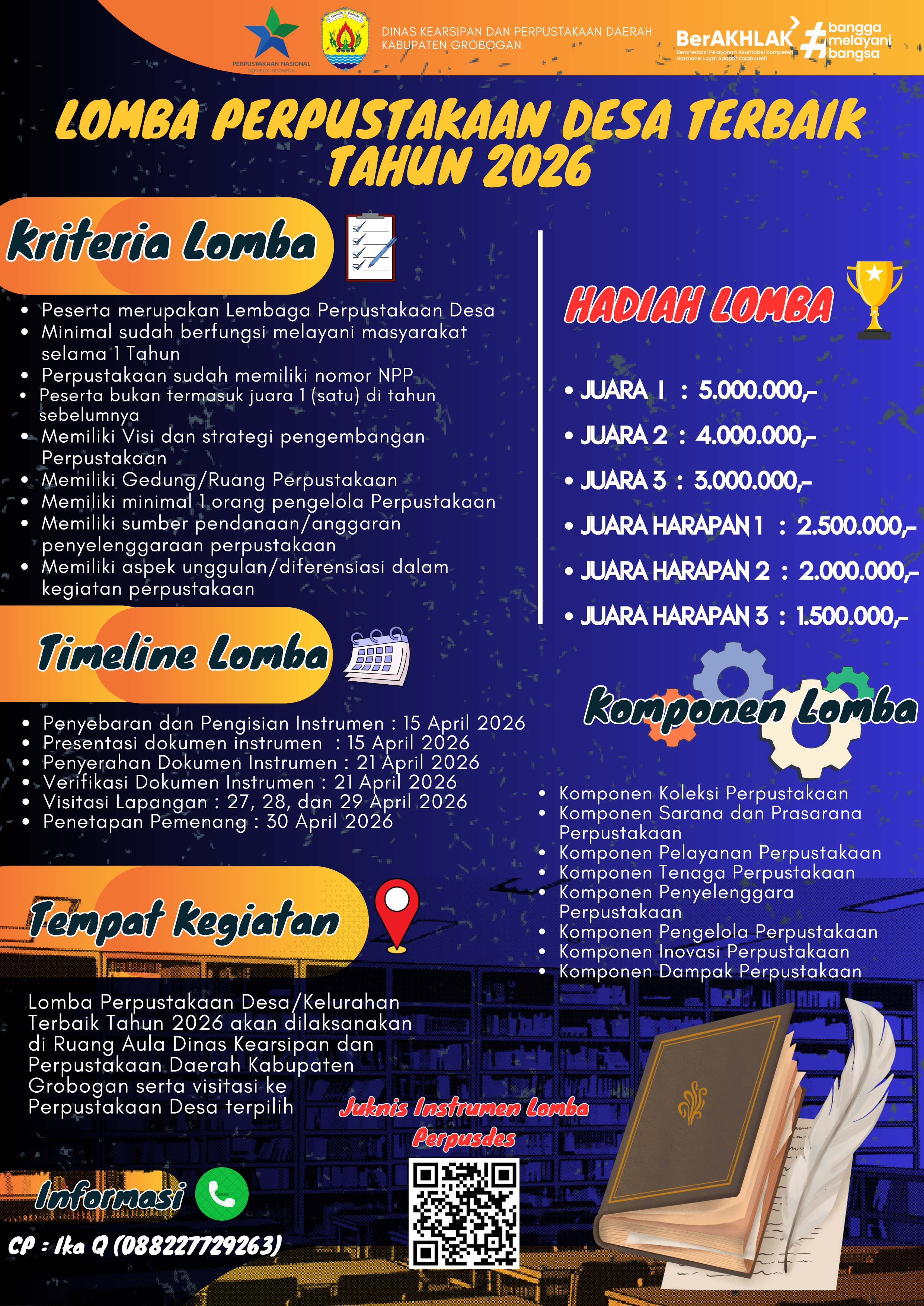 Kami mengundang seluruh Perpustakaan Desa/Kelurahan untuk ikut serta dalam Lomba Perpustakaan Desa Terbaik Tahun 2026 dengan berbagai kriteria dan komponen penilaian yang mencakup koleksi, layanan, sarana prasarana, inovasi, hingga dampak perpustakaan bagi masyarakat.
