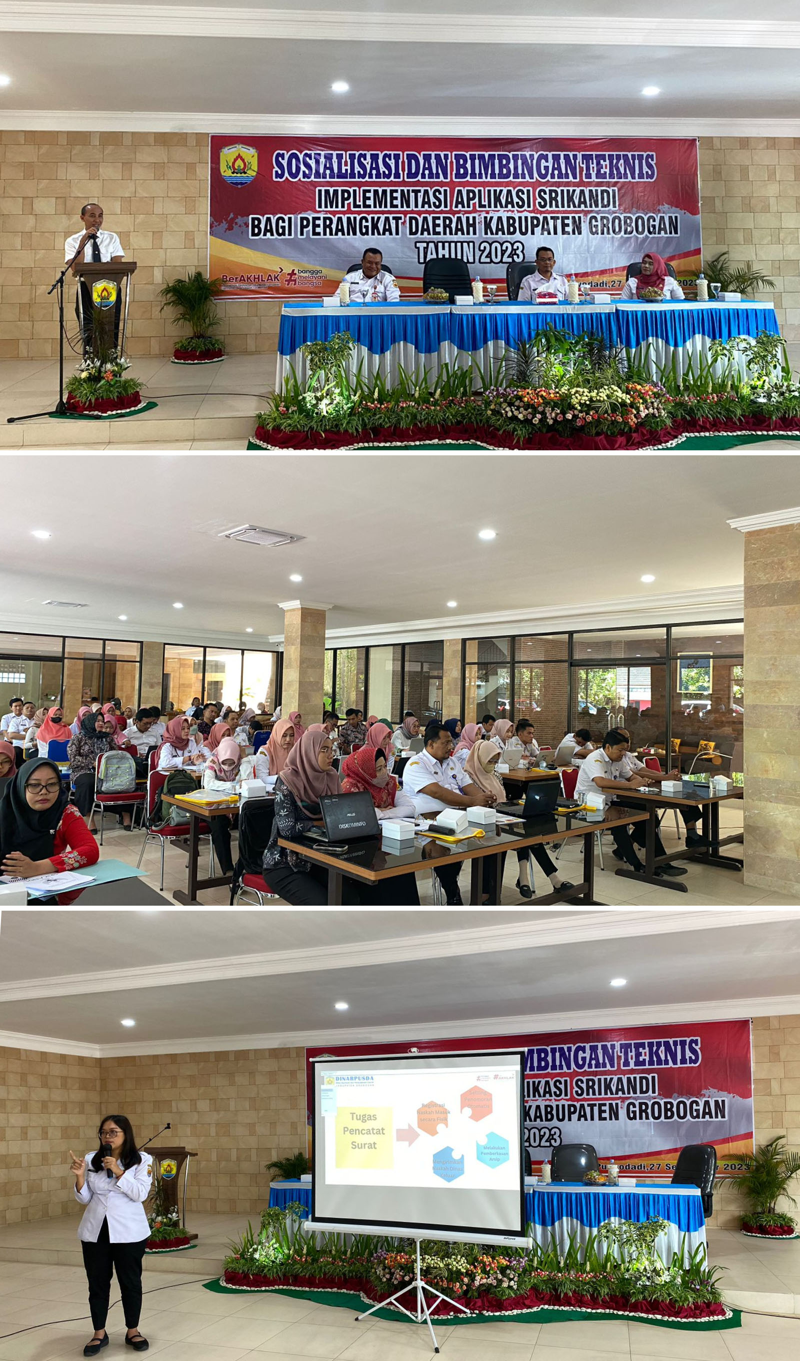 Purwodadi (27/9/2023) Dinas Kearsipan dan Perpustakaan Daerah Kabupaten Grobogan menyelenggarakan Bimbingan Teknis Implementasi Aplikasi SRIKANDI Versi 2 bagi Perangkat Daerah di Kabupaten Grobogan, bertempat di Hotel Diafan Purwodadi. Bimbingan teknis berlangsung selama 1 (satu) hari pada tanggal 27 September 2023, dibuka oleh Sekretaris Daerah Kabupaten Grobogan yaitu Bapak Anang Armunanto, S.Sos, M.Si. Bimbingan teknis ini dilaksanakan sebagi tindak lanjut dari diterimanya akun Live Aplikasi SRIKANDI oleh Pemerintah Kabupaten serta dalam rangka percepatan penerapan Aplikasi SRIKANDI di lingkungan Pemerintah Kabupaten Grobogan. Penyelenggaraan bimbingan teknis ini memberikan bekal bagi para Kasubag Umum dan Kepegawaian serta para admini Aplikasi SRIKANDI perangkat daerah dengan praktik proses registrasi surat masuk dan keluar, disposisi surat dan pembuatan naskah dinas secara elektronik.