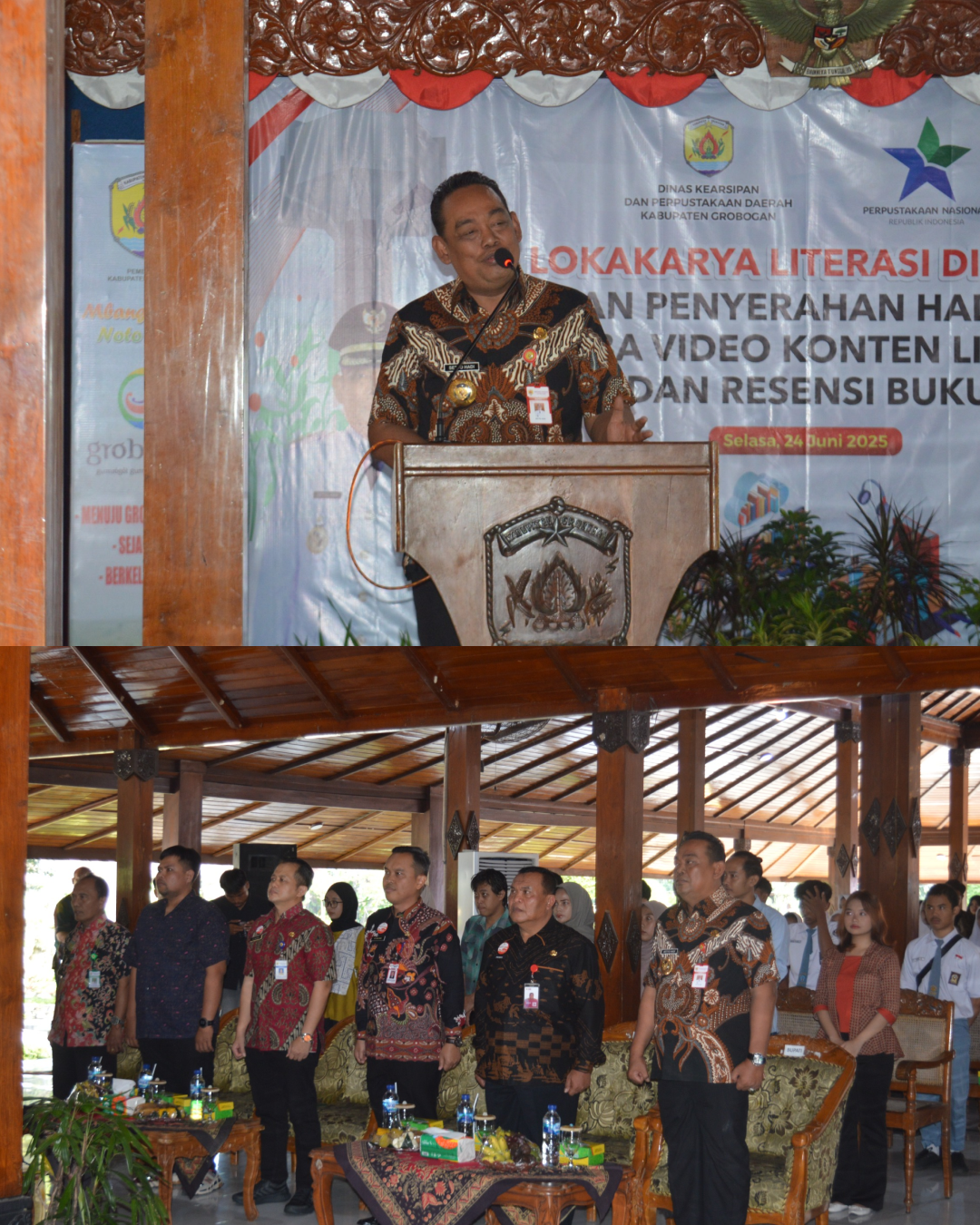 Selasa, 24 Juni 2025 — Dalam rangka memperkuat budaya literasi berbasis kearifan lokal dan mendorong pemanfaatan teknologi informasi dalam penyebaran pengetahuan, Dinas Kearsipan dan Perpustakaan Daerah Kabupaten Grobogan menyelenggarakan kegiatan Lokakarya Literasi Digital dan Penyerahan Hadiah Lomba Video Konten Literasi dan Resensi Buku. Kegiatan ini berlangsung di Pendopo Kabupaten Grobogan dan dihadiri oleh berbagai unsur pemangku kepentingan seperti perangkat daerah, lembaga pendidikan, komunitas literasi, serta pelajar dan mahasiswa.