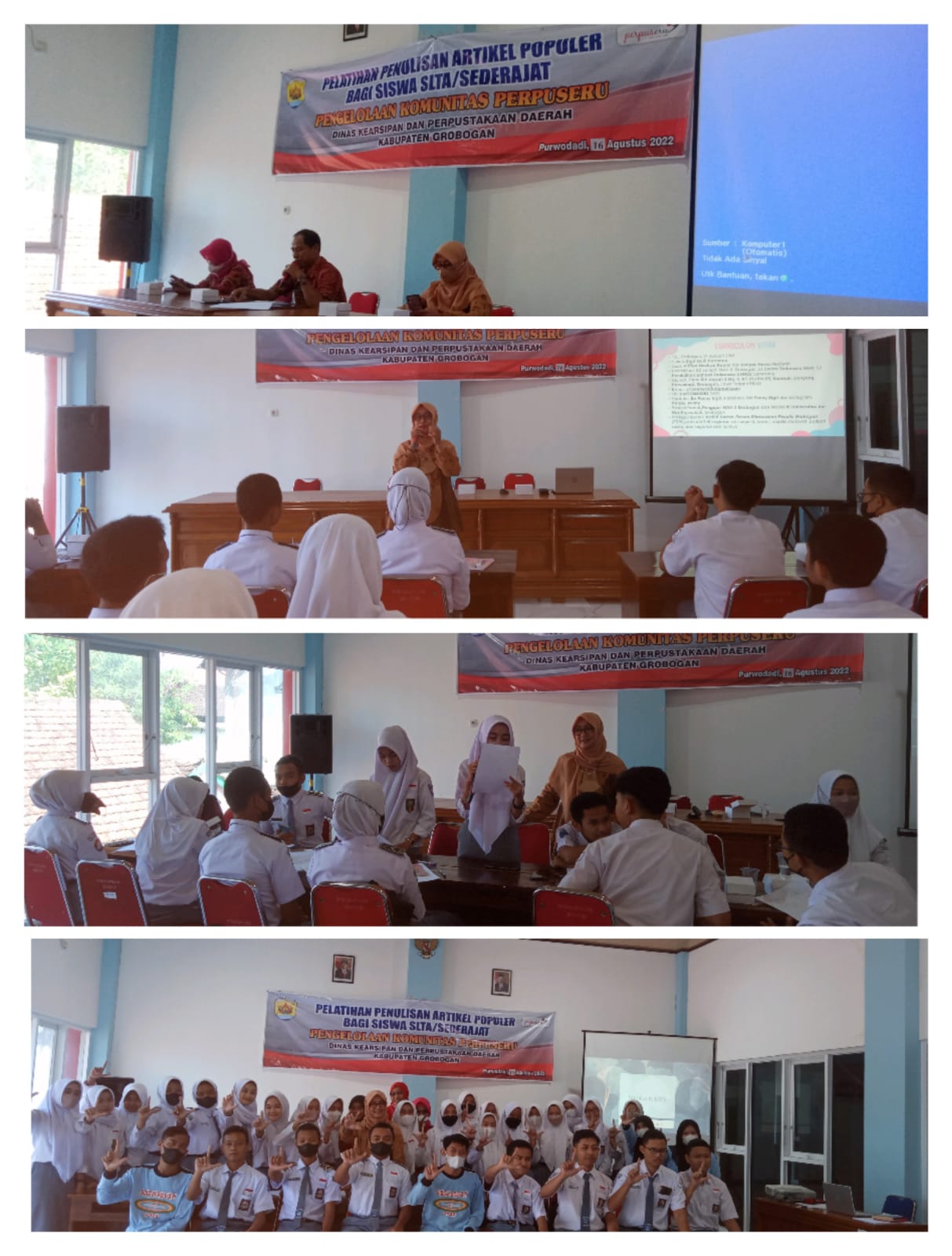 Dinas Kearsipan dan Perpustakaan Daerah (Dinarpusda) Kabupaten Grobogan pada hari Selasa, 16 Agustus 2022 melalui program pengembangan dan budaya baca melaksanakan kegiatan “Pelatihan Penulisan artikel Populer” bagi pelajar SLTA Kabupaten Grobogan. Kegiatan tersebut dibuka oleh Bapak Priyo Dwiyanto, SE. MM. (Kepala Bidang Perpustakaan Dinarpusda Grobogan) mewakili Kepala Dinarpusda. Dalam sambutannya peserta diajak untuk menggunakan kesempatan pelatihan ini dengan sebaik-baiknya untuk menambah wawasan dan pengetahun mengenai menulis artikel.
