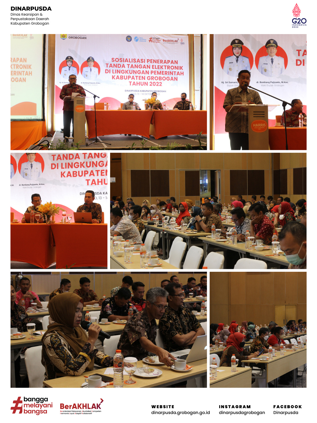 SURAKARTA – Sebagai salah satu bentuk dukungan dalam penerapan Sistem Pemerintahan Berbasis Elektronik (SPBE), Pemerintah Kabupaten Grobogan melalui Dinas Kearsipan dan Perpustakaan Daerah telah menyelenggarakan Sosialisasi Penerapan Tanda Tangan Elektronik (TTE) kepada Seluruh Kepala Organisasi Perangkat Daerah dilingkungan Pemerintah Kabupaten Grobogan di Surakarta, 13-14 Oktober 2022. Sosialisasi Penerapan Tanda Tangan Elektronik ini mengundang Narasumber dari BSrE BSSN RI, Dinas Kearsipan dan Perpustakaan Provinsi Jawa Tengah, dan Tim GRMS Dinas Komunikasi dan Informatika Provinsi Jawa Tengah. Tujuan dari Sosialisasi ini guna memberikan pemahaman yang sama dalam proses penerbitan dan penggunaan Tanda Tangan Elektronik (TTE).