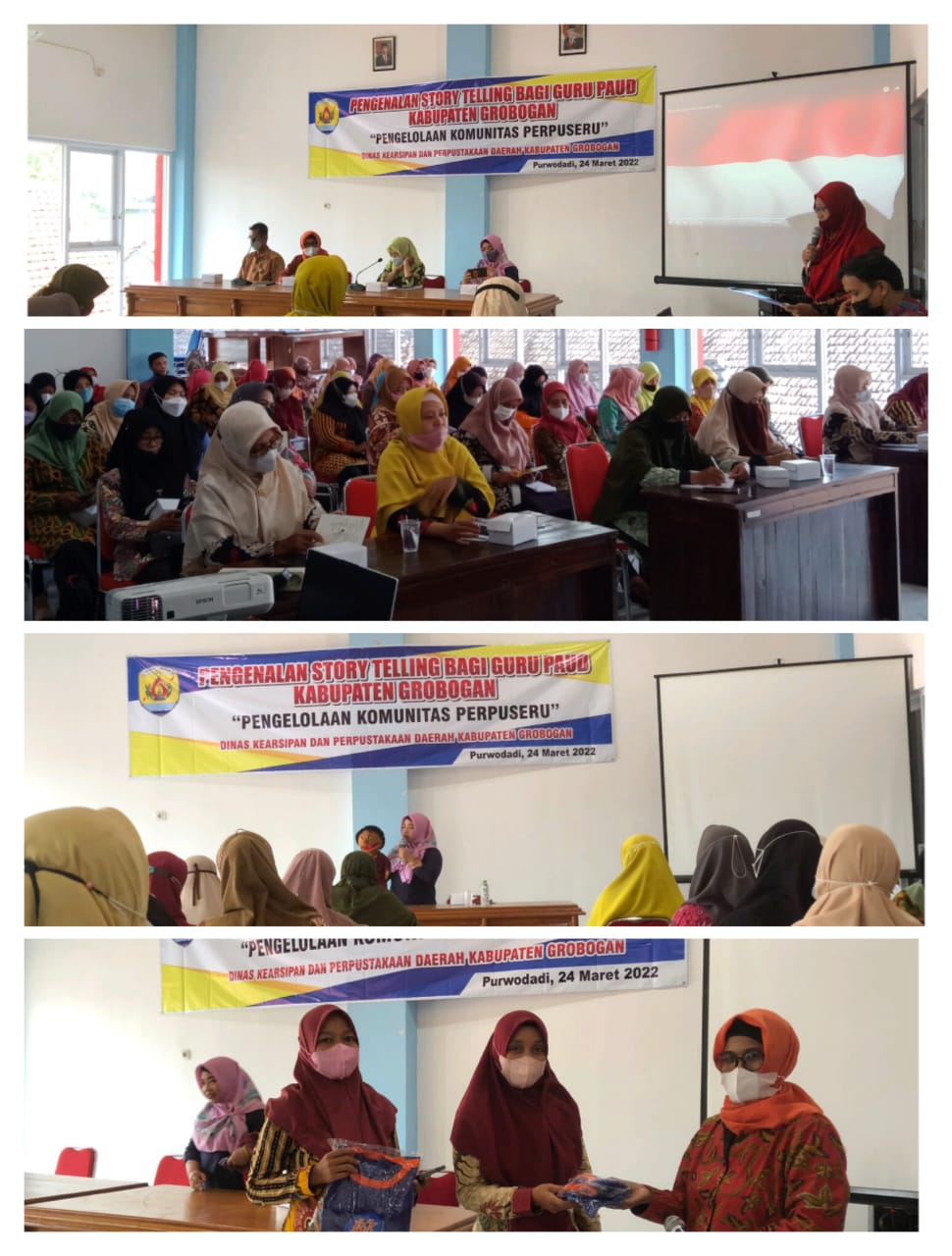 Dalam rangka meningkatkan kompetensi dan kreatifitas bagi Guru PAUD (Pendidikan Anak Usia Dini) dalam bercerita guna menumbuhkan minat baca anak sejak dini, maka Dinas Kearsipan dan Perpustakaan Daerah Kabupaten Grobogan pada Kamis, 24 Maret 2022 menyelenggarakan Pelatihan Story Telling bagi Guru PAUD Kabupaten Grobogan.