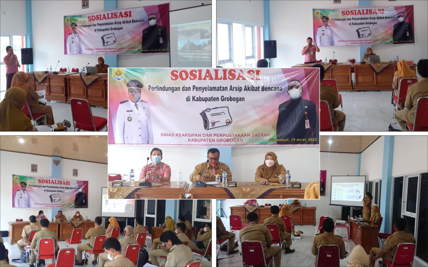 Selasa, 29 Maret 2022 Dinas Kearsipan dan Perpustakaan Daerah Kabupaten Grobogan menyelenggarakan Sosialisasi Perlindungan dan Penyelamatan Arsip Akibat Bencana. Sosialisasi ini diikuti 33 perwakilan dari desa yang rawan bencana di kabupaten Grobogan serta mendatangkan narasumber dari Dinas Kearsipan dan Perpustakaan Provinsi Jawa Tengah Bapak Dwi Kristanti, S.ST.Ars. dan narasumber dari Dinas Kearsipan dan Perpustakaan Daerah Kab. Grobogan. Tujuan dari diselenggarakannya sosialisasi ini adalah guna memberikan pengetahuan upaya perlindungan dan penyelamatan arsip akibat bencana kepada Kepala Desa di 33 Desa Rawan Bencana di Kabupaten Grobogan.